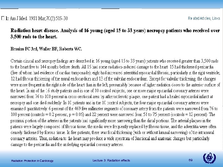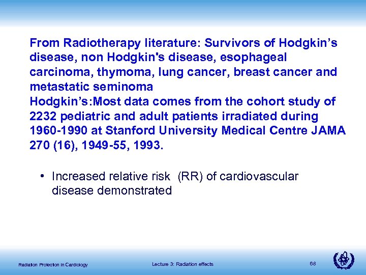 From Radiotherapy literature: Survivors of Hodgkin’s disease, non Hodgkin's disease, esophageal carcinoma, thymoma, lung cancer, breast cancer and metastatic seminoma Hodgkin’s: Most data comes from the cohort study of 2232 pediatric and adult patients irradiated during 1960 -1990 at Stanford University Medical Centre JAMA 270 (16), 1949 -55, 1993. • Increased relative risk (RR) of cardiovascular disease demonstrated Radiation Protection in Cardiology Lecture 3: Radiation effects 68