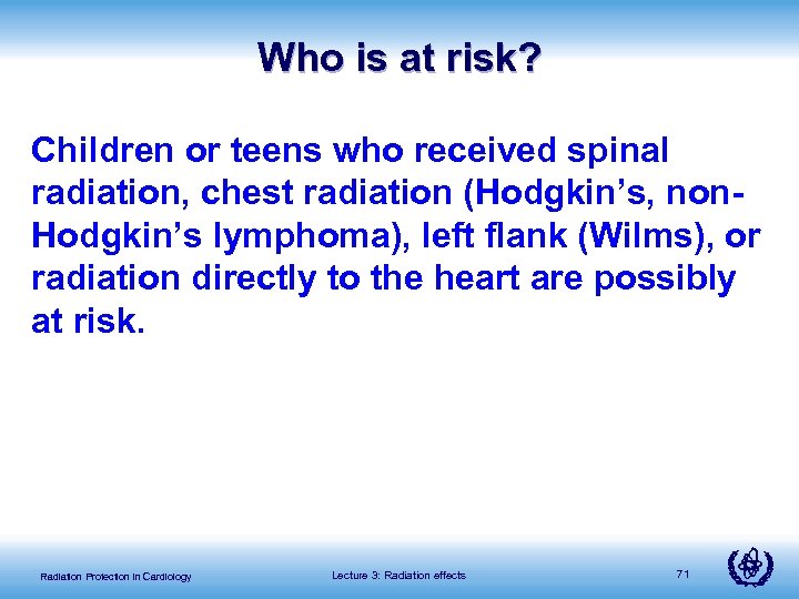 Who is at risk? Children or teens who received spinal radiation, chest radiation (Hodgkin’s, non. Hodgkin’s lymphoma), left flank (Wilms), or radiation directly to the heart are possibly at risk. Radiation Protection in Cardiology Lecture 3: Radiation effects 71