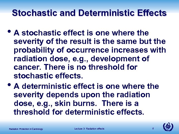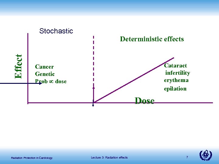 Effect Stochastic Deterministic effects Cataract infertility erythema epilation Cancer Genetic Prob dose Dose Radiation Protection in Cardiology Lecture 3: Radiation effects 7
