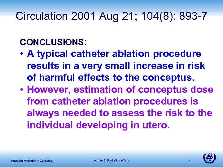 Circulation 2001 Aug 21; 104(8): 893 -7 CONCLUSIONS: • A typical catheter ablation procedure results in a very small increase in risk of harmful effects to the conceptus. • However, estimation of conceptus dose from catheter ablation procedures is always needed to assess the risk to the individual developing in utero. Radiation Protection in Cardiology Lecture 3: Radiation effects 73