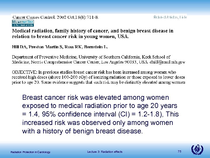 Breast cancer risk was elevated among women exposed to medical radiation prior to age 20 years = 1. 4, 95% confidence interval (CI) = 1. 2 -1. 8), This increased risk was observed only among women with a history of benign breast disease. Radiation Protection in Cardiology Lecture 3: Radiation effects 75