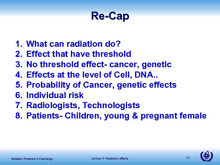 Re-Cap 1. 2. 3. 4. 5. 6. 7. 8. What can radiation do? Effect that have threshold No threshold effect- cancer, genetic Effects at the level of Cell, DNA. . Probability of Cancer, genetic effects Individual risk Radiologists, Technologists Patients- Children, young & pregnant female Radiation Protection in Cardiology Lecture 3: Radiation effects 77