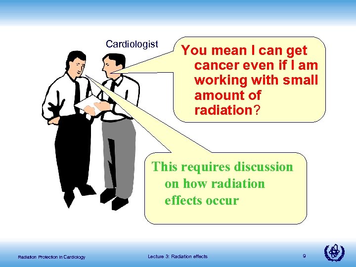 Cardiologist You mean I can get cancer even if I am working with small amount of radiation? This requires discussion on how radiation effects occur Radiation Protection in Cardiology Lecture 3: Radiation effects 9