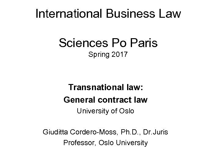 International Business Law Sciences Po Paris Spring 2017 Transnational law: General contract law University of Oslo Giuditta Cordero-Moss, Ph. D. , Dr. Juris Professor, Oslo University