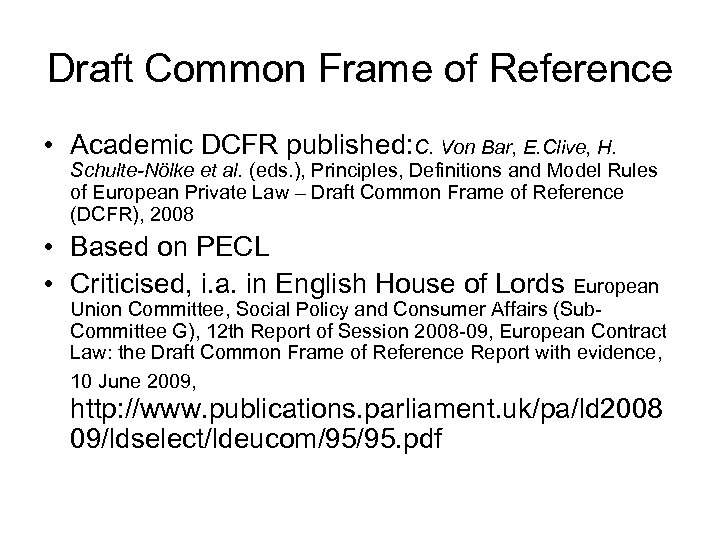 Draft Common Frame of Reference • Academic DCFR published: C. Von Bar, E. Clive, H. Schulte-Nölke et al. (eds. ), Principles, Definitions and Model Rules of European Private Law – Draft Common Frame of Reference (DCFR), 2008 • Based on PECL • Criticised, i. a. in English House of Lords European Union Committee, Social Policy and Consumer Affairs (Sub. Committee G), 12 th Report of Session 2008 -09, European Contract Law: the Draft Common Frame of Reference Report with evidence, 10 June 2009, http: //www. publications. parliament. uk/pa/ld 2008 09/ldselect/ldeucom/95/95. pdf