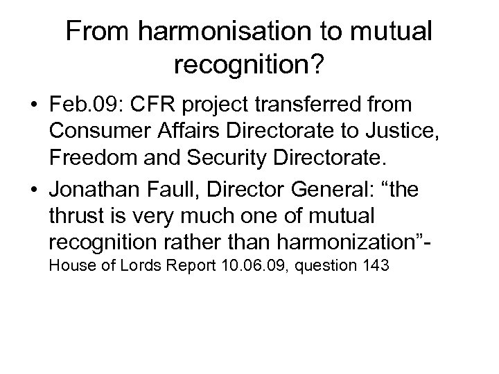 From harmonisation to mutual recognition? • Feb. 09: CFR project transferred from Consumer Affairs Directorate to Justice, Freedom and Security Directorate. • Jonathan Faull, Director General: “the thrust is very much one of mutual recognition rather than harmonization”House of Lords Report 10. 06. 09, question 143