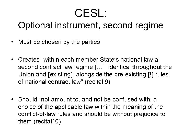 CESL: Optional instrument, second regime • Must be chosen by the parties • Creates “within each member State’s national law a second contract law regime … identical throughout the Union and existing alongside the pre-existing ! rules of national contract law” (recital 9) • Should “not amount to, and not be confused with, a choice of the applicable law within the meaning of the conflict-of-law rules and should be without prejudice to them (recital 10)