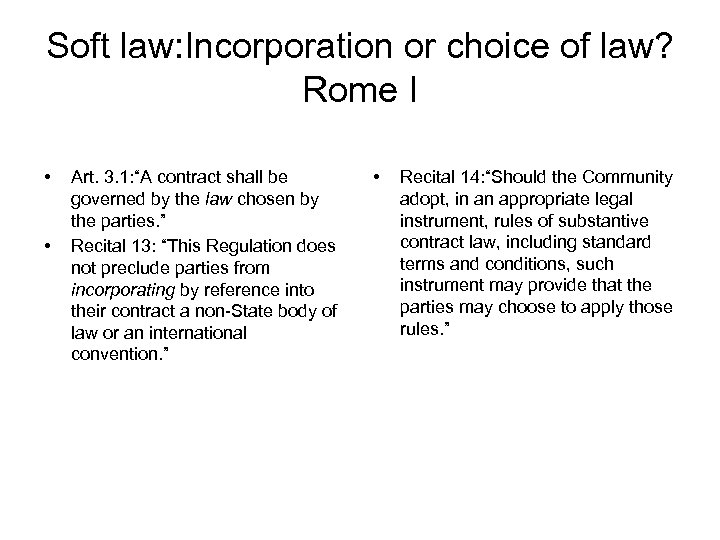 Soft law: Incorporation or choice of law? Rome I • • Art. 3. 1: “A contract shall be governed by the law chosen by the parties. ” Recital 13: “This Regulation does not preclude parties from incorporating by reference into their contract a non-State body of law or an international convention. ” • Recital 14: “Should the Community adopt, in an appropriate legal instrument, rules of substantive contract law, including standard terms and conditions, such instrument may provide that the parties may choose to apply those rules. ”