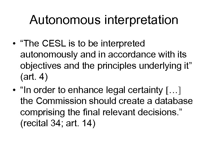 Autonomous interpretation • “The CESL is to be interpreted autonomously and in accordance with its objectives and the principles underlying it” (art. 4) • “In order to enhance legal certainty … the Commission should create a database comprising the final relevant decisions. ” (recital 34; art. 14)