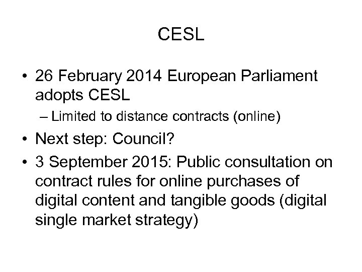 CESL • 26 February 2014 European Parliament adopts CESL – Limited to distance contracts (online) • Next step: Council? • 3 September 2015: Public consultation on contract rules for online purchases of digital content and tangible goods (digital single market strategy)