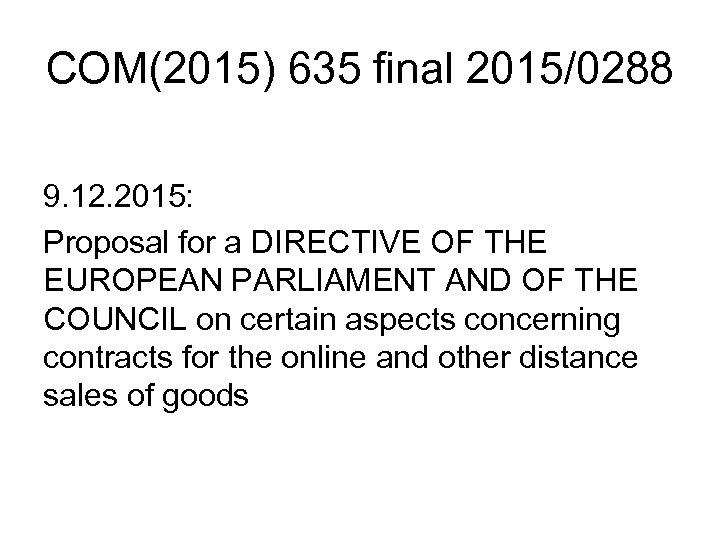 COM(2015) 635 final 2015/0288 9. 12. 2015: Proposal for a DIRECTIVE OF THE EUROPEAN PARLIAMENT AND OF THE COUNCIL on certain aspects concerning contracts for the online and other distance sales of goods