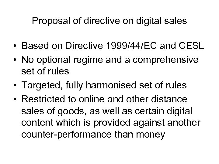 Proposal of directive on digital sales • Based on Directive 1999/44/EC and CESL • No optional regime and a comprehensive set of rules • Targeted, fully harmonised set of rules • Restricted to online and other distance sales of goods, as well as certain digital content which is provided against another counter-performance than money