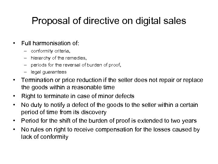 Proposal of directive on digital sales • Full harmonisation of: – – conformity criteria, hierarchy of the remedies, periods for the reversal of burden of proof, legal guarantees • Termination or price reduction if the seller does not repair or replace the goods within a reasonable time • Right to terminate in case of minor defects • No duty to notify a defect of the goods to the seller within a certain period of time from its discovery • Period for the shift of the burden of proof is extended to two years • No rules on right to receive compensation for the losses caused by lack of conformity