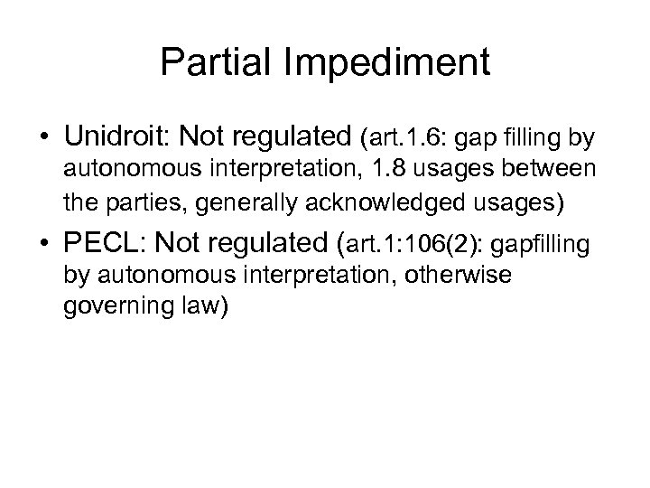 Partial Impediment • Unidroit: Not regulated (art. 1. 6: gap filling by autonomous interpretation, 1. 8 usages between the parties, generally acknowledged usages) • PECL: Not regulated (art. 1: 106(2): gapfilling by autonomous interpretation, otherwise governing law)