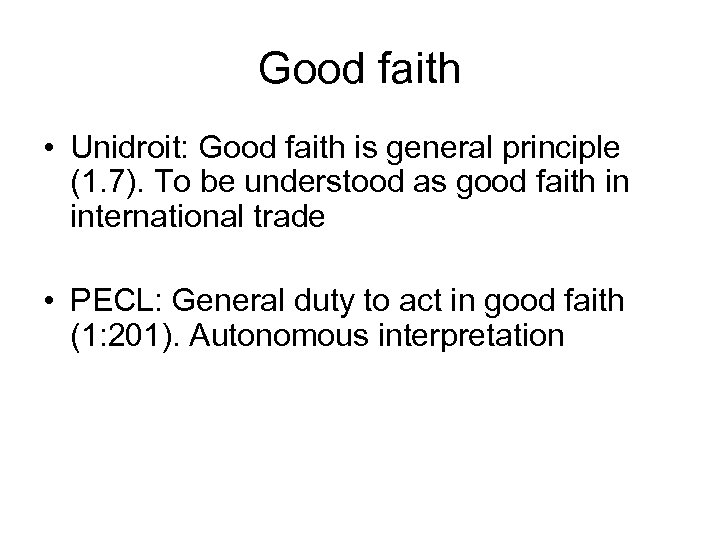 Good faith • Unidroit: Good faith is general principle (1. 7). To be understood as good faith in international trade • PECL: General duty to act in good faith (1: 201). Autonomous interpretation