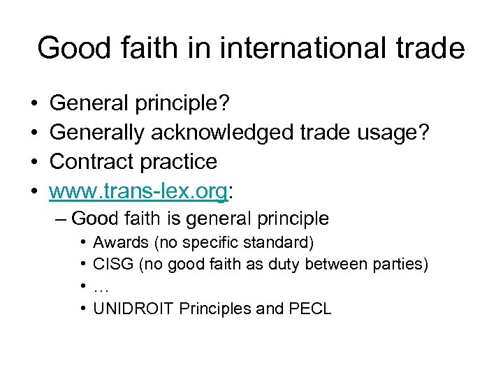 Good faith in international trade • • General principle? Generally acknowledged trade usage? Contract practice www. trans-lex. org: – Good faith is general principle • • Awards (no specific standard) CISG (no good faith as duty between parties) … UNIDROIT Principles and PECL