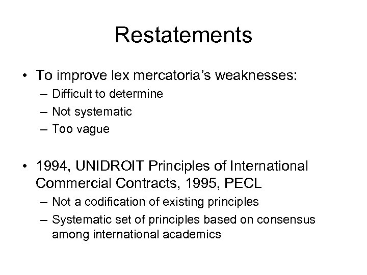 Restatements • To improve lex mercatoria’s weaknesses: – Difficult to determine – Not systematic – Too vague • 1994, UNIDROIT Principles of International Commercial Contracts, 1995, PECL – Not a codification of existing principles – Systematic set of principles based on consensus among international academics