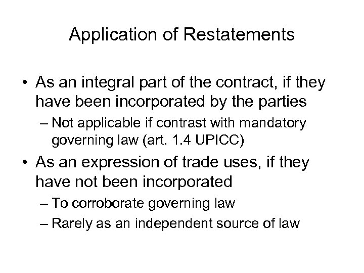 Application of Restatements • As an integral part of the contract, if they have been incorporated by the parties – Not applicable if contrast with mandatory governing law (art. 1. 4 UPICC) • As an expression of trade uses, if they have not been incorporated – To corroborate governing law – Rarely as an independent source of law