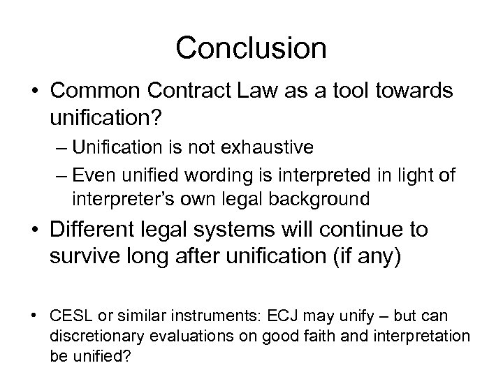 Conclusion • Common Contract Law as a tool towards unification? – Unification is not exhaustive – Even unified wording is interpreted in light of interpreter’s own legal background • Different legal systems will continue to survive long after unification (if any) • CESL or similar instruments: ECJ may unify – but can discretionary evaluations on good faith and interpretation be unified?