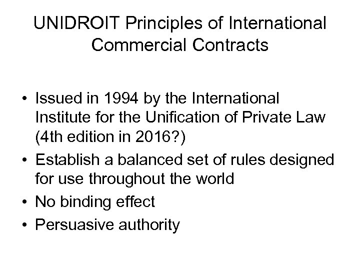 UNIDROIT Principles of International Commercial Contracts • Issued in 1994 by the International Institute for the Unification of Private Law (4 th edition in 2016? ) • Establish a balanced set of rules designed for use throughout the world • No binding effect • Persuasive authority