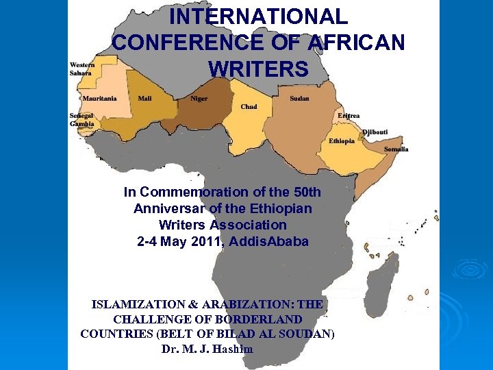 INTERNATIONAL CONFERENCE OF AFRICAN WRITERS In Commemoration of the 50 th Anniversar of the Ethiopian Writers Association 2 -4 May 2011, Addis. Ababa ISLAMIZATION & ARABIZATION: THE CHALLENGE OF BORDERLAND COUNTRIES (BELT OF BILAD AL SOUDAN) Dr. M. J. Hashim