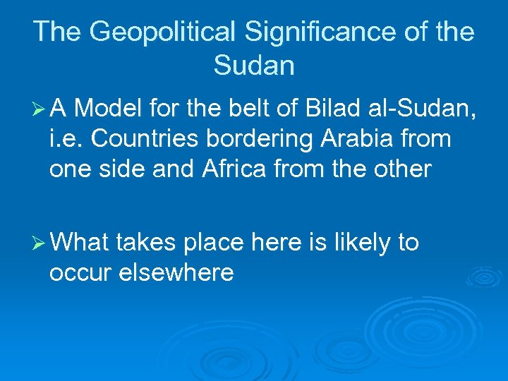 The Geopolitical Significance of the Sudan Ø A Model for the belt of Bilad al-Sudan, i. e. Countries bordering Arabia from one side and Africa from the other Ø What takes place here is likely to occur elsewhere
