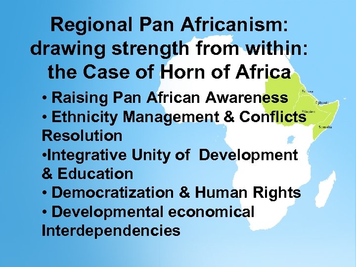 Regional. Pan Africanism: Regional drawingstrength from within: Strength from Within: drawing the Case of the Horn Africa of Africa the Case of Horn of • Raising Pan African Awareness • Ethnicity Management & Conflicts Ø Raising and enhancing Pan African Resolution Awareness • Integrative Unity of Development Ø Integrative Unity & Education Ø Democratization & Human Rights • Developmental economical Ø Developing economical Interdependencies