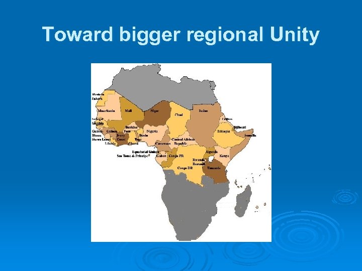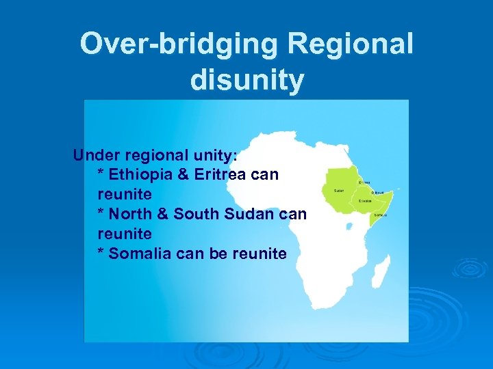 Over-bridging Regional disunity Under regional unity: * Ethiopia & Eritrea can reunite * North & South Sudan can reunite * Somalia can be reunite