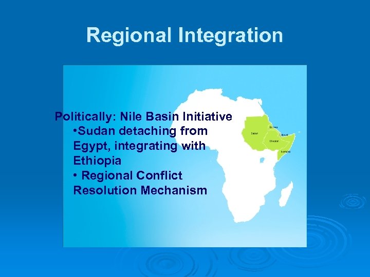Regional Integration Politically: Nile Basin Initiative • Sudan detaching from Egypt, integrating with Ethiopia • Regional Conflict Resolution Mechanism