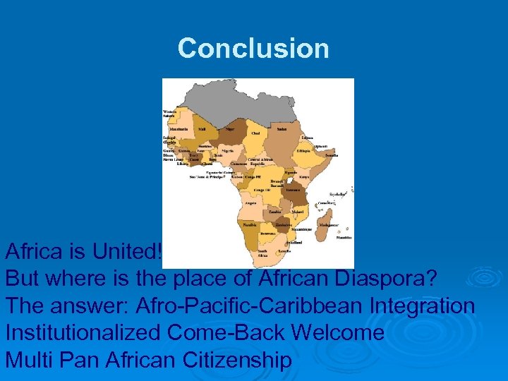 Conclusion Africa is United! But where is the place of African Diaspora? The answer: Afro-Pacific-Caribbean Integration Institutionalized Come-Back Welcome Multi Pan African Citizenship