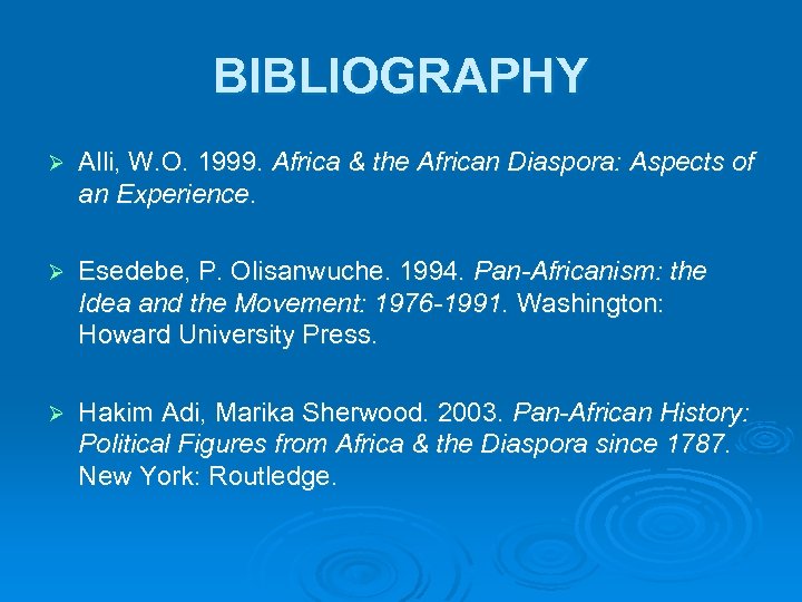 BIBLIOGRAPHY Ø Alli, W. O. 1999. Africa & the African Diaspora: Aspects of an Experience. Ø Esedebe, P. Olisanwuche. 1994. Pan-Africanism: the Idea and the Movement: 1976 -1991. Washington: Howard University Press. Ø Hakim Adi, Marika Sherwood. 2003. Pan-African History: Political Figures from Africa & the Diaspora since 1787. New York: Routledge.