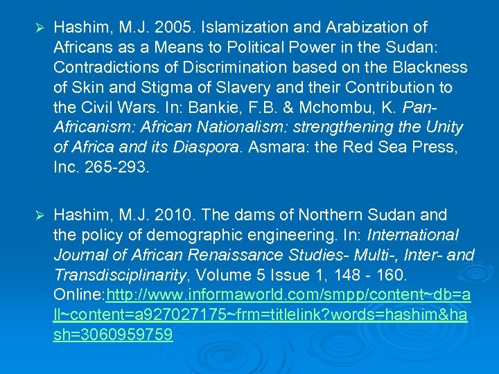 Ø Hashim, M. J. 2005. Islamization and Arabization of Africans as a Means to Political Power in the Sudan: Contradictions of Discrimination based on the Blackness of Skin and Stigma of Slavery and their Contribution to the Civil Wars. In: Bankie, F. B. & Mchombu, K. Pan. Africanism: African Nationalism: strengthening the Unity of Africa and its Diaspora. Asmara: the Red Sea Press, Inc. 265 -293. Ø Hashim, M. J. 2010. The dams of Northern Sudan and the policy of demographic engineering. In: International Journal of African Renaissance Studies- Multi-, Inter- and Transdisciplinarity, Volume 5 Issue 1, 148 - 160. Online: http: //www. informaworld. com/smpp/content~db=a ll~content=a 927027175~frm=titlelink? words=hashim&ha sh=3060959759