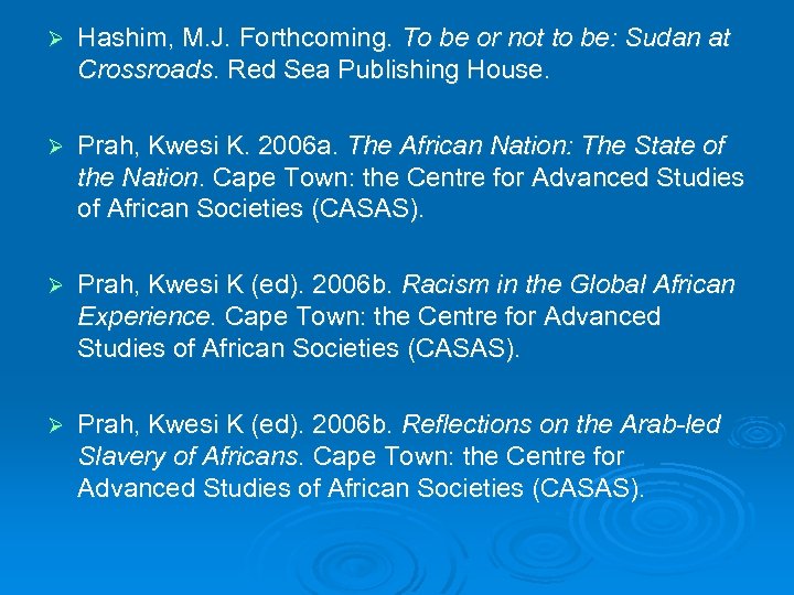 Ø Hashim, M. J. Forthcoming. To be or not to be: Sudan at Crossroads. Red Sea Publishing House. Ø Prah, Kwesi K. 2006 a. The African Nation: The State of the Nation. Cape Town: the Centre for Advanced Studies of African Societies (CASAS). Ø Prah, Kwesi K (ed). 2006 b. Racism in the Global African Experience. Cape Town: the Centre for Advanced Studies of African Societies (CASAS). Ø Prah, Kwesi K (ed). 2006 b. Reflections on the Arab-led Slavery of Africans. Cape Town: the Centre for Advanced Studies of African Societies (CASAS).