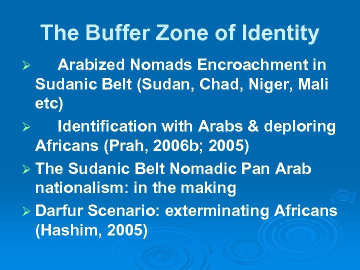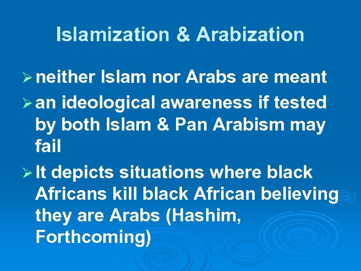 Islamization & Arabization Ø neither Islam nor Arabs are meant Ø an ideological awareness if tested by both Islam & Pan Arabism may fail Ø It depicts situations where black Africans kill black African believing they are Arabs (Hashim, Forthcoming)
