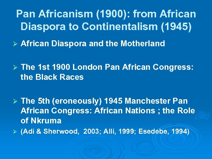 Pan Africanism (1900): from African Diaspora to Continentalism (1945) Ø African Diaspora and the Motherland Ø The 1 st 1900 London Pan African Congress: the Black Races Ø The 5 th (eroneously) 1945 Manchester Pan African Congress: African Nations ; the Role of Nkruma Ø (Adi & Sherwood, 2003; Alli, 1999; Esedebe, 1994)