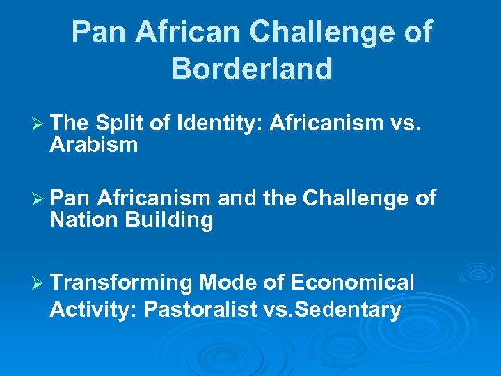 Pan African Challenge of Borderland Ø The Split of Identity: Africanism vs. Arabism Ø Pan Africanism and the Challenge of Nation Building Ø Transforming Mode of Economical Activity: Pastoralist vs. Sedentary