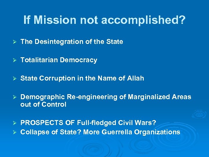 If Mission not accomplished? Ø The Desintegration of the State Ø Totalitarian Democracy Ø State Corruption in the Name of Allah Ø Demographic Re-engineering of Marginalized Areas out of Control PROSPECTS OF Full-fledged Civil Wars? Ø Collapse of State? More Guerrella Organizations Ø