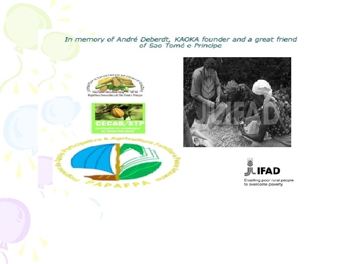 Background: how the whole story started (bio-cocoa value chain) • São Tomé: largest international cocoa exporter in early 1900 s : 40, 000 MT in 1930 • After independence (1975) steady drop of production till 4, 000 MT in 1990 • Land reform (WB supported) in the mid-nineties: 8, 000 smallholders were created • In 1995, IFAD, in cooperation with France, put in place a «National support to smallholders programme (PNAPAF)» which included extension services, diversification, rural infrastructure and microfinance • Price volatility of cocoa, the major source of smallholders’ revenues in STP, was devastating: from USD 1, 300/ton in January 1998 to USD 700/MT in December 1999. Smallholders were abandoning their lands; • In 2003, IFAD started funding a new programme (12 years): the “Participatory Smallholder Agriculture & Artisanal Fisheries Development Project (PAPAFPA)”; • Contact was made with KAOKA (leading enterprise in the French chocolate market). New marketing strategy recommended, based on: aromatic and origin features + organic certification to access niche EU markets • New intervention strategy based on: PPP establishment + stable price + quality premiums + turn producers into professional market players (CECAB created)