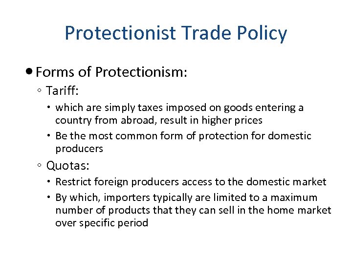 Protectionist Trade Policy Forms of Protectionism: ◦ Tariff: which are simply taxes imposed on goods entering a country from abroad, result in higher prices Be the most common form of protection for domestic producers ◦ Quotas: Restrict foreign producers access to the domestic market By which, importers typically are limited to a maximum number of products that they can sell in the home market over specific period