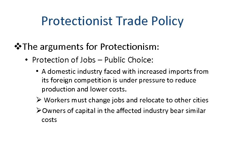 Protectionist Trade Policy v. The arguments for Protectionism: • Protection of Jobs – Public Choice: • A domestic industry faced with increased imports from its foreign competition is under pressure to reduce production and lower costs. Ø Workers must change jobs and relocate to other cities ØOwners of capital in the affected industry bear similar costs