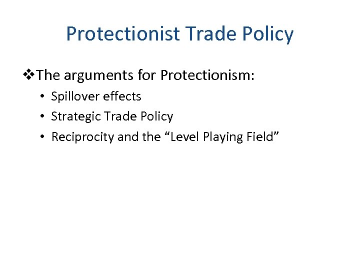 Protectionist Trade Policy v. The arguments for Protectionism: • Spillover effects • Strategic Trade Policy • Reciprocity and the “Level Playing Field”
