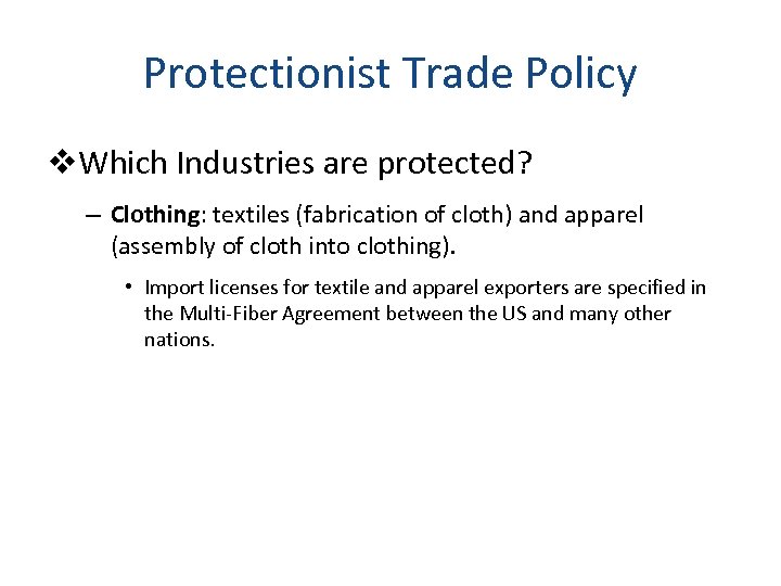 Protectionist Trade Policy v. Which Industries are protected? – Clothing: textiles (fabrication of cloth) and apparel (assembly of cloth into clothing). • Import licenses for textile and apparel exporters are specified in the Multi-Fiber Agreement between the US and many other nations.