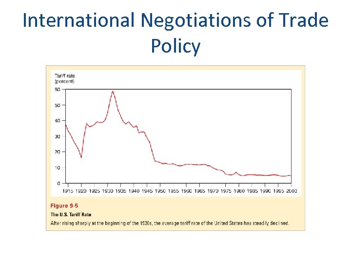 International Negotiations of Trade Policy • The average US tariff rate on dutiable imports has decreased substantially from 1920– 1993. • Since 1944, much of the reduction in tariffs and other trade restrictions came about through international negotiations. – The General Agreement of Tariffs and Trade was begun in 1947 as a provisional international agreement and was replaced by a more formal international institution called the World Trade Organization in 1995.