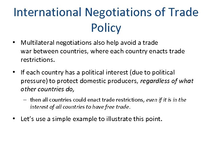 International Negotiations of Trade Policy • Multilateral negotiation mobilize exporters to support free trade if they believe export markets will expand. – This support would be lacking in a unilateral push for free trade. – This support counteracts the support for restricted trade by import-competing groups.