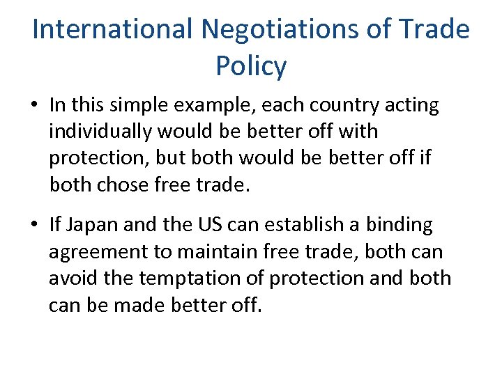 International Negotiations of Trade Policy • In this simple example, each country acting individually would be better off with protection, but both would be better off if both chose free trade. • If Japan and the US can establish a binding agreement to maintain free trade, both can avoid the temptation of protection and both can be made better off.