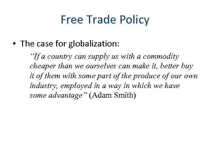 Free Trade Policy • The case for globalization: “If a country can supply us with a commodity cheaper than we ourselves can make it, better buy it of them with some part of the produce of our own industry, employed in a way in which we have some advantage” (Adam Smith)