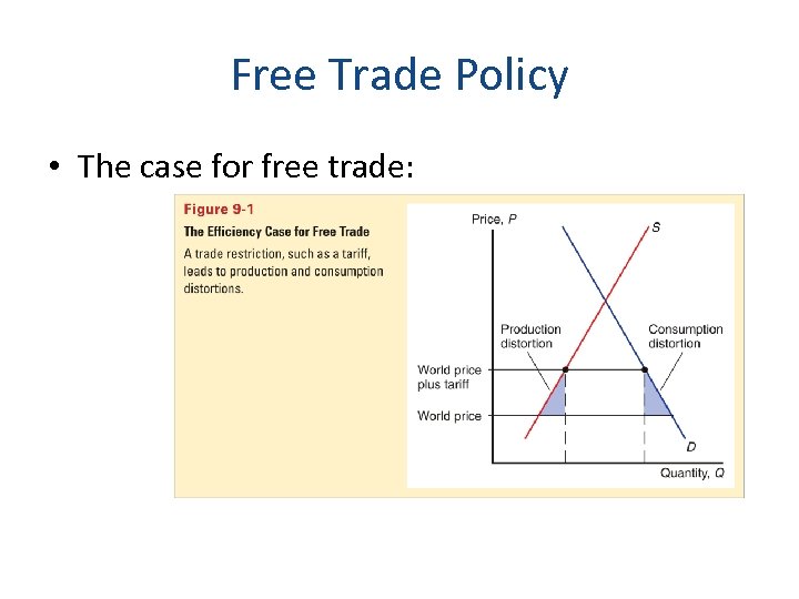 Free Trade Policy • The case for free trade: – The first case for free trade is the argument that producers and consumers allocate resources most efficiently when governments do not distort market prices through trade policy. • National welfare of a small country is highest with free trade. • With restricted trade, consumers pay higher prices. • With restricted trade, distorted prices cause overproduction either by existing firms producing more or by more firms entering the industry.