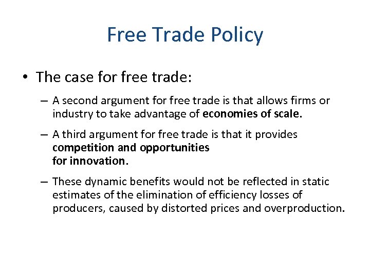 Free Trade Policy • The case for free trade: – A second argument for free trade is that allows firms or industry to take advantage of economies of scale. – A third argument for free trade is that it provides competition and opportunities for innovation. – These dynamic benefits would not be reflected in static estimates of the elimination of efficiency losses of producers, caused by distorted prices and overproduction.