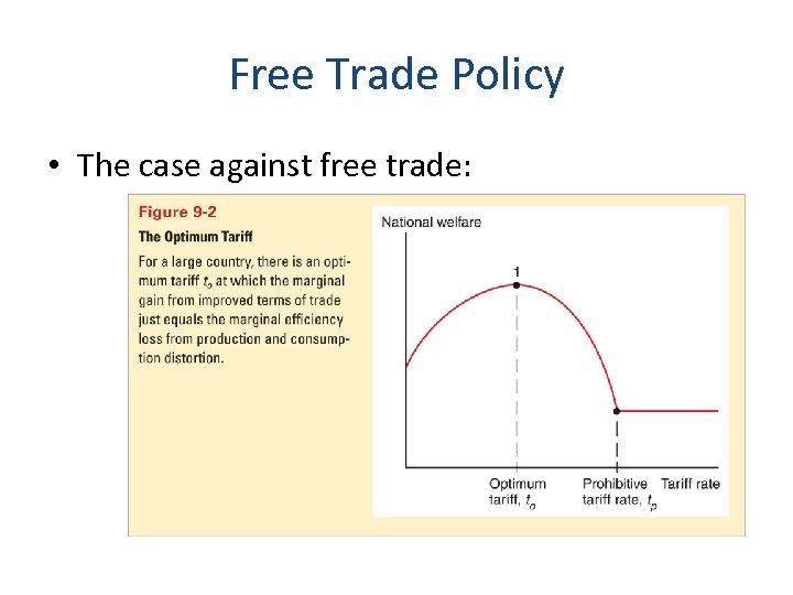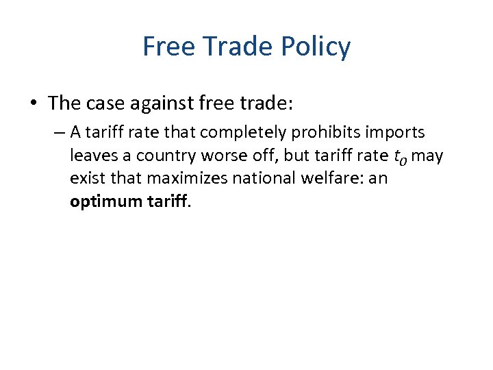 Free Trade Policy • The case against free trade: – A tariff rate that completely prohibits imports leaves a country worse off, but tariff rate t 0 may exist that maximizes national welfare: an optimum tariff.
