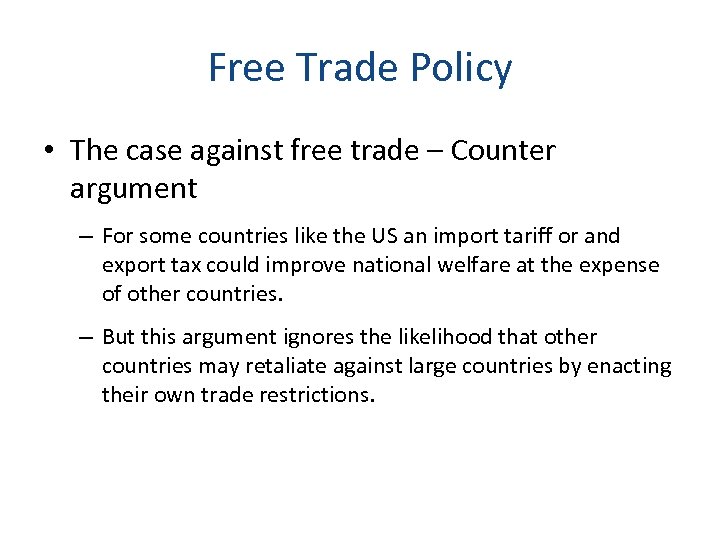 Free Trade Policy • The case against free trade – Counter argument – For some countries like the US an import tariff or and export tax could improve national welfare at the expense of other countries. – But this argument ignores the likelihood that other countries may retaliate against large countries by enacting their own trade restrictions.